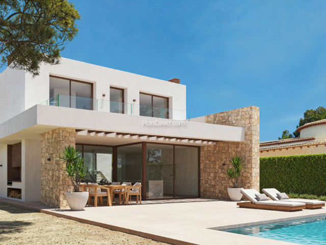 Two modern, designer villas are being built on these flat plots with views to the sea over a green zone forest border.